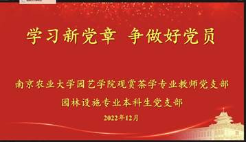 为学习贯彻党的二十大精神,2022年12月8日,观赏茶学专业教师党支部和园林设施专业本科生党支部开展了“学习新党章 争做好党员”的支部共建活动,马克思主义学院陈蕊老师为两个支部的党员同志讲解了《中国共产党章程》。