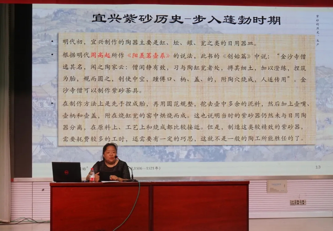一壶一款式,一壶一故事,一壶一历史。6位老师分别对紫砂陶的发展历史、紫砂壶的不同款式及其背后的故事进行了解读,并特别讲述了“报春”壶的故事,壶的雏形最初由中央工艺美院的高庄教授设计,在此基础上老艺人朱可心守正创新,历经21年不断创制修改终得“报春”,以梅花寓意坚定的意志,傲霜斗雪,铁骨冰肌,“报春”壶也成为一代深受海内外欢迎的经典器型,为我国赚取了大量外汇,支援了国家建设。高级乡村振兴技艺师汪叶老师讲到,“天地有大美而无言”,手工紫砂的魅力随着历史的积淀,得到了来自社会各界越来越多的认可与推崇。如今,传统手工制壶技艺已被列为我国的非物质文化遗产。作为非遗传承人要传承的不仅是工艺技艺,更要将一代代紫砂艺人的工匠精神继承发扬下去。做紫砂壶需要高强度的精神集中,一坐上泥凳就是十几个小时,非常磨人心性,从最基本的“拍泥片、打身筒”开始,一件作品不知道要重复多少次,稍有瑕疵,就马上重来。现在回忆起来,正是她的姑妈——老一辈紫砂艺人汪寅仙的言传身教,时时影响着汪叶对艺术的态度。这种对艺术精益求精的态度影响和感动着汪叶,让她的紫砂之路越走越宽。