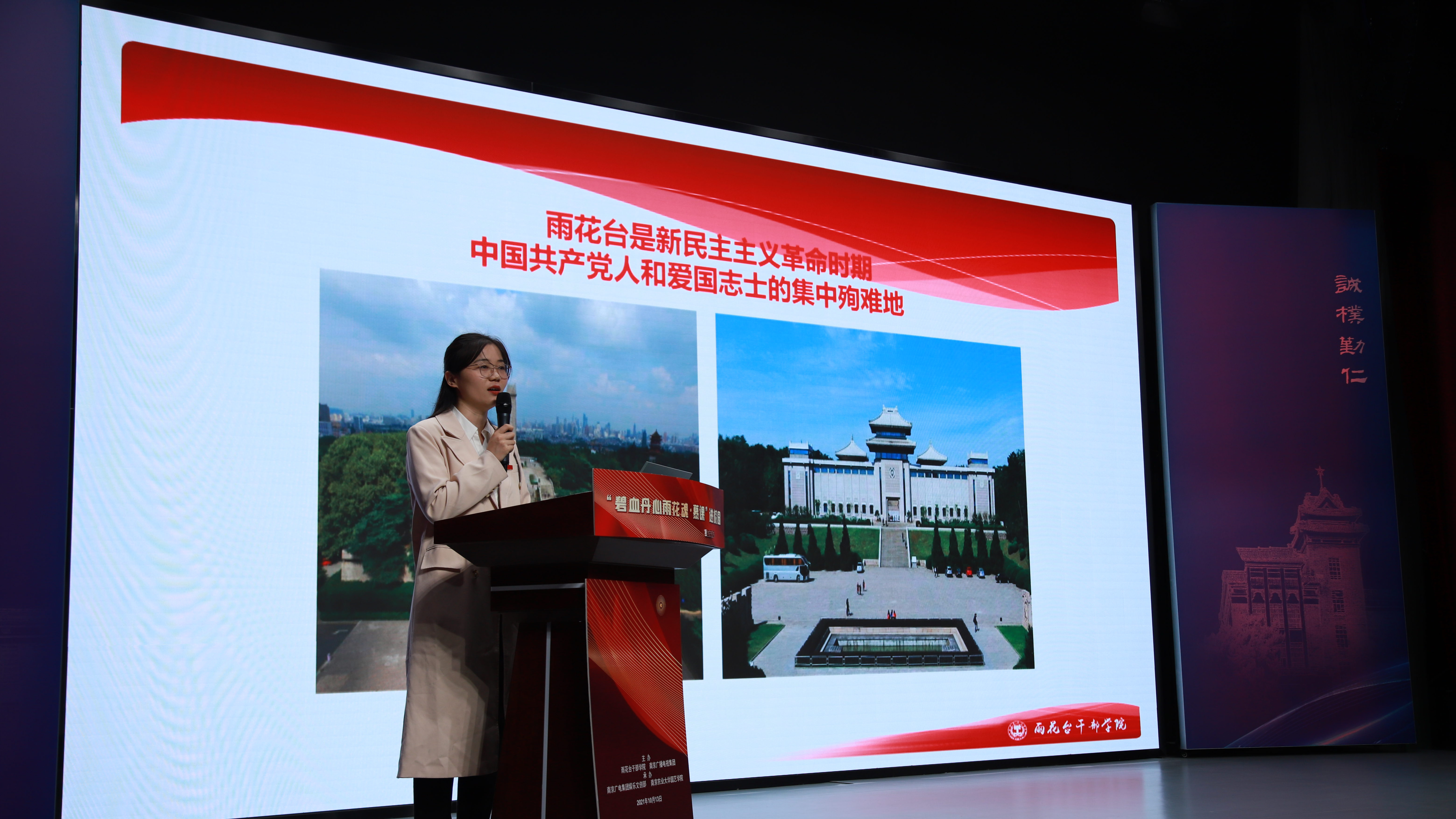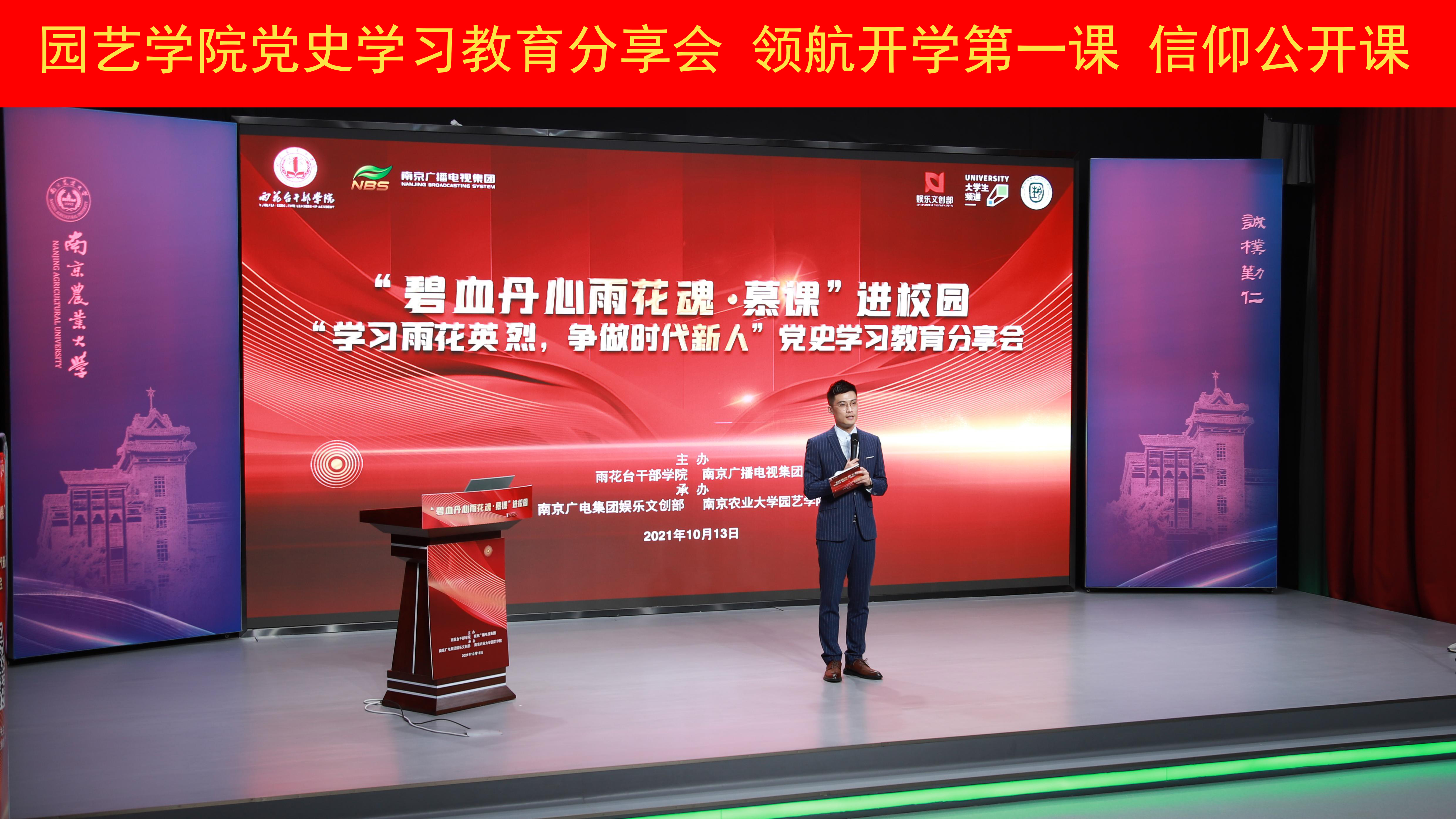 党委深化党史学习教育、领航开学第一课、信仰公开课的重要举措,旨在为大学生树立正确人生观、价值观提供帮助,通过积极传播雨花英烈的故事,大力弘扬英烈精神,激励在校大学生爱党爱国、扎实学习、报效社会。本次活动得到南京电视台大学生频道的大力支持,在Live南京频道、牛咔视频App等平台全程直播。