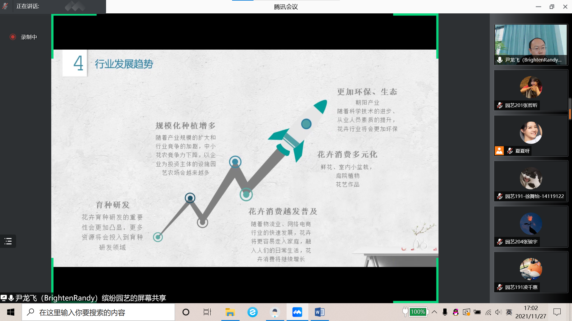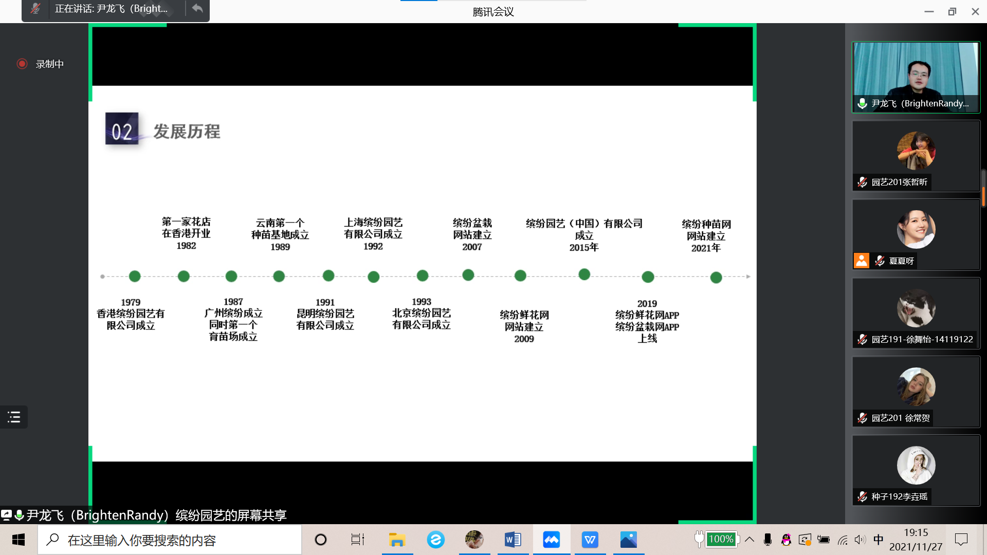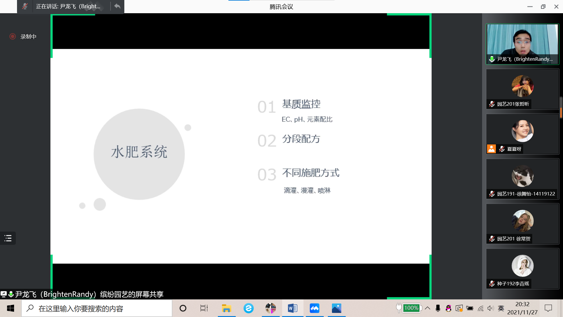11月27日,学院邀请了缤纷园艺(中国)有限公司种苗总监黄仲恩先生、市场总监闫永兵先生、盆栽总监褚宪明先生通过线上腾讯会议的方式分别为同学们介绍了花卉行业的发展、缤纷的创建与发展以及花卉行业的前沿知识。下午黄仲恩先生首先为同学们介绍了花卉行业的历史发展,并分析了行业发展趋势,表示花卉行业从业者的使命就是立志用美丽的自然色彩装点人们的生活,实现中国跻身世界园艺强国的伟大梦想。晚上闫永兵先生从公司简介、发展历程、品牌创建以及麻豆在线四个方面为同学们详细地介绍了缤纷园艺(中国)有限公司;褚宪明先生从盆花的产品标准、生产管理、病虫害防治以及水肥系统为同学们讲解了花卉行业技术领域的前沿知识,帮助同学们了拓展学识,开阔了视野,激发了大家创新思维,助力大家提升学习、实践和创新的整体能力。课程结束之后,同学们踊跃提问,展现了对花卉行业甚至农业行业的热情与兴趣,同学们希望更深入了解目前全国花卉种植技术的发展等内容。