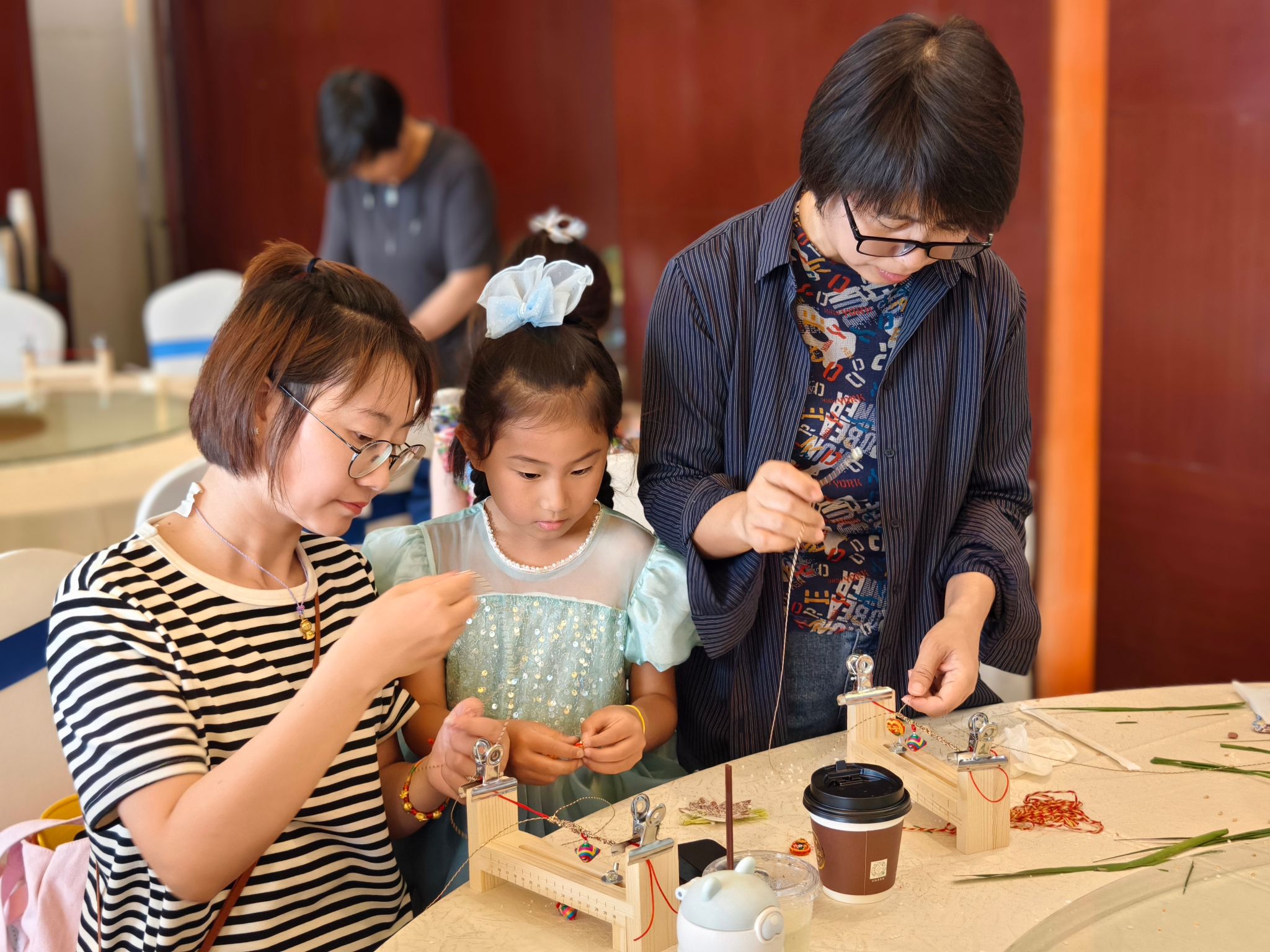 翰苑紫金厅内,节日氛围浓厚,大小朋友欢聚一堂,本次文化体验活动内容包括传统包粽子、非遗项目漆扇制作和编手绳等传统手工艺制作。