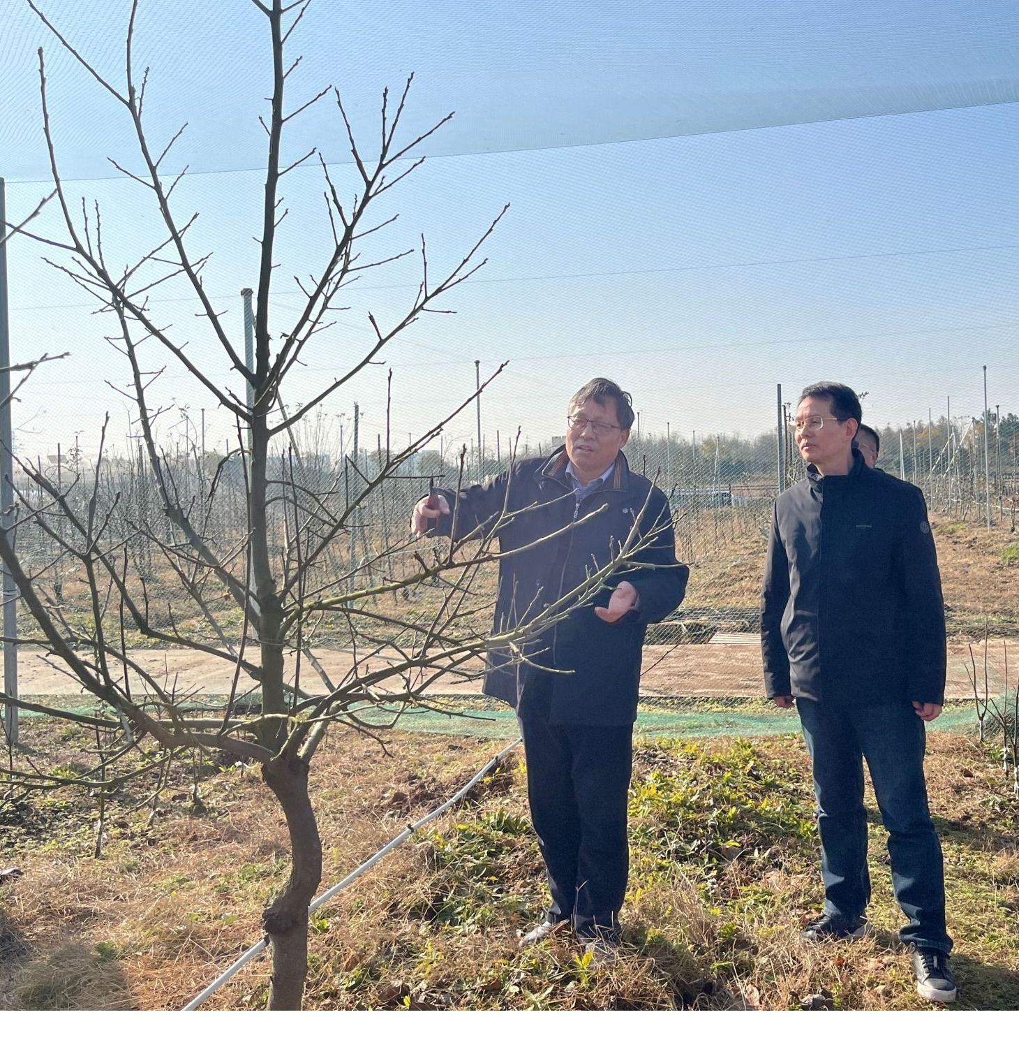 初冬的白马教学科研基地暖阳迎客,柿科研种质圃内,保种树上金灿灿的甜柿仍旧沉甸甸的缀满枝头,一眼望去仍能让人看出秋季的一派丰收景象。在这里,渠慎春教授将育人思政元素融入果树修剪实践课,在传授专业修剪技术的同时,让党员们领悟到“一元领导”在管理服务工作中的重要性。