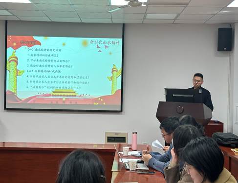 的建校历史,发展历程及辉煌成就。伴随着南农的崛起,学校中的“法国梧桐”,“武林”,“主楼”和“一二三学生宿舍”等标志性建筑刻画在了南农的历史长河中,并涌现出一批具有南农精神的时代楷模。研制出治疗疟疾“救命药”的毛宗良教授,研制青霉素的樊庆笙教授,三访罗布泊的彭加木教授等老一代南农人用他们的辛勤与汗水铸就了南农的浓厚底蕴,并始终践行着“诚朴勤仁”的校训与精神。他们与南农同心协力,为国家农业快速发展和脱贫攻坚贡献出“南农力量”。南农和南农人艰苦卓绝,坚韧不拔的奋斗精神勉励着在场所有党员,要诚信做人,诚实做事;求真求善、质朴敦厚;勤敏砺学、持之以恒;心系苍生、仁爱天下。全体党员对南农精神有了深刻的理解,并针对如何继承并