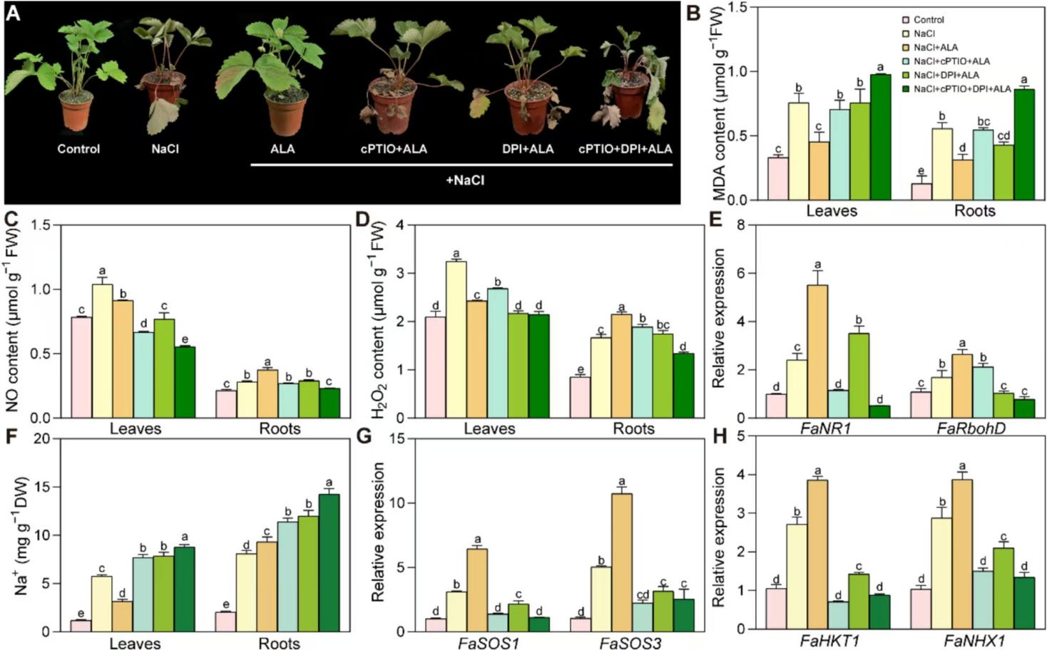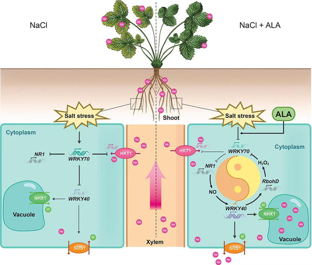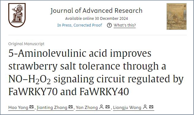 汪良驹教授团队在国际综合性TOP期刊Journal of Advanced Research(Q1,IF:11.4)上发表了题为“5-Aminolevulinic acid improves strawberry salt tolerance through a NO–H2O2signaling circuit regulated by FaWRKY70 and FaWRKY40”的研究论文,揭示了两个新的转录因子FaWRKY70和FaWRKY40各自转录调控NO和H2O2之间复杂传导关系,以及进一步调控Na+的外排、区隔化分布以及木质部截留的效应,为ALA在植物耐盐栽培上应用提供了理论依据,为耐盐植物育种提供了基因资源。