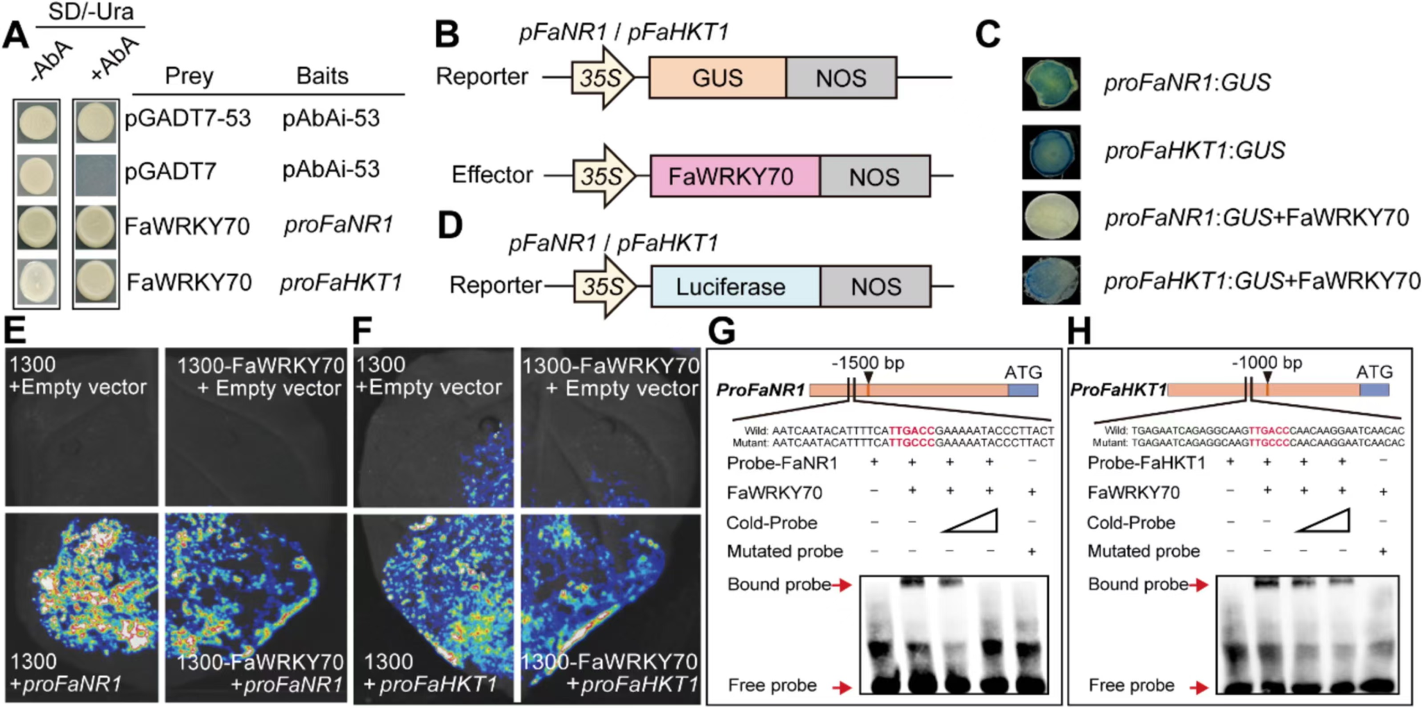 图3 FaWRKY70结合并抑制FaNR1和FaHKT1启动子活性