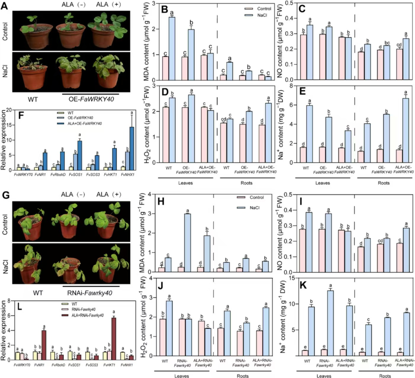 利用转录组数据,作者挖掘一个WRKY类转录因子FaWRKY40。该基因在盐胁迫下表达受到ALA诱导。将FaWRKY40在大叶烟草(Nicotiana tabacum)和森林草莓(Fragaria vesca)中过表达(图2),则植株耐盐性显著增强;若干扰表达,则森林草莓耐盐性显著降低;若用ALA处理,则进一步增强转基因草莓耐盐性。分析显示,FaWRKY40通过结合并激活FaRbohD、FaSOS1和FaNHX1启动子活性参与调节根系中H2O2产生、Na+外排和液泡区隔的调节。