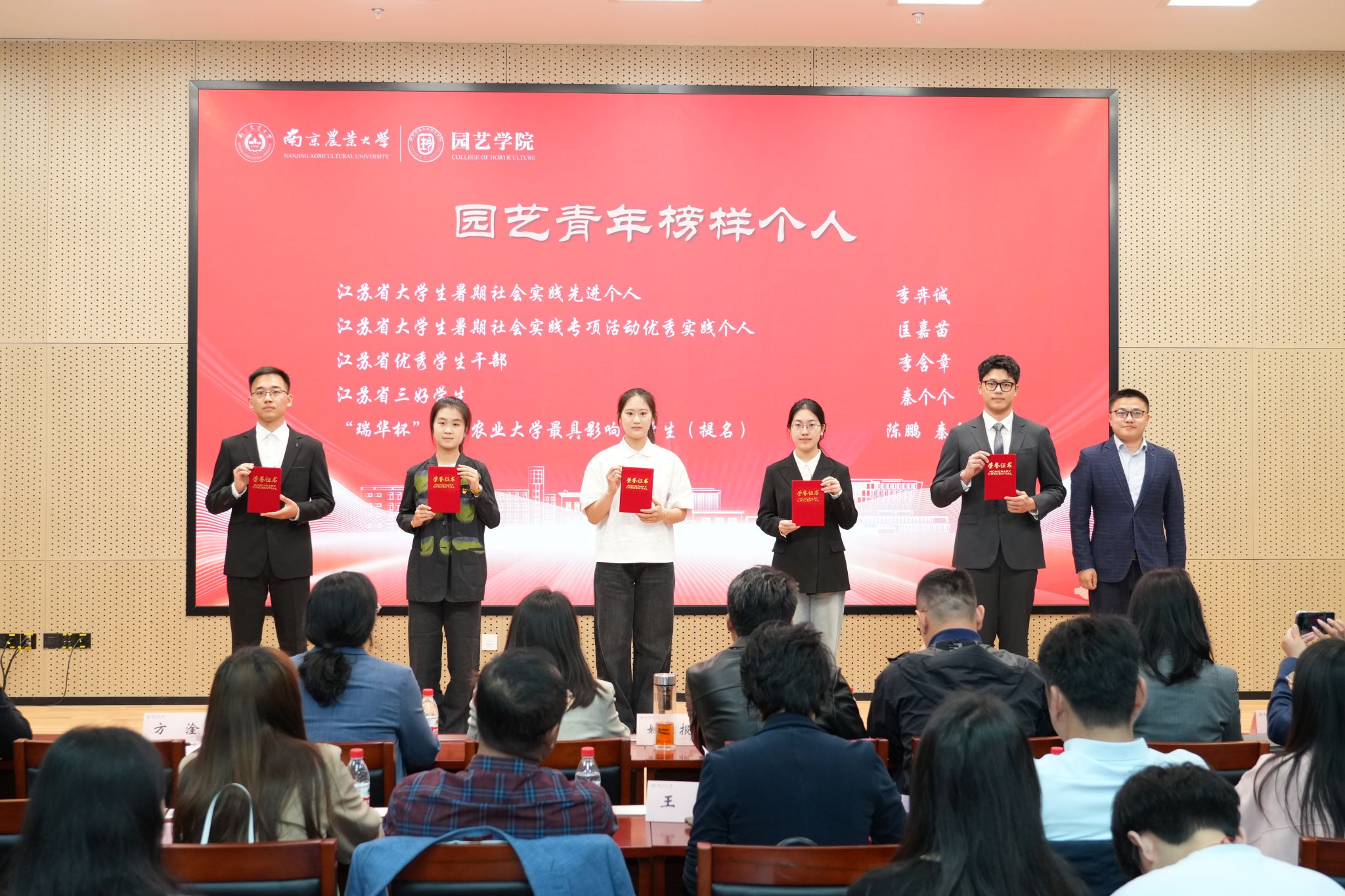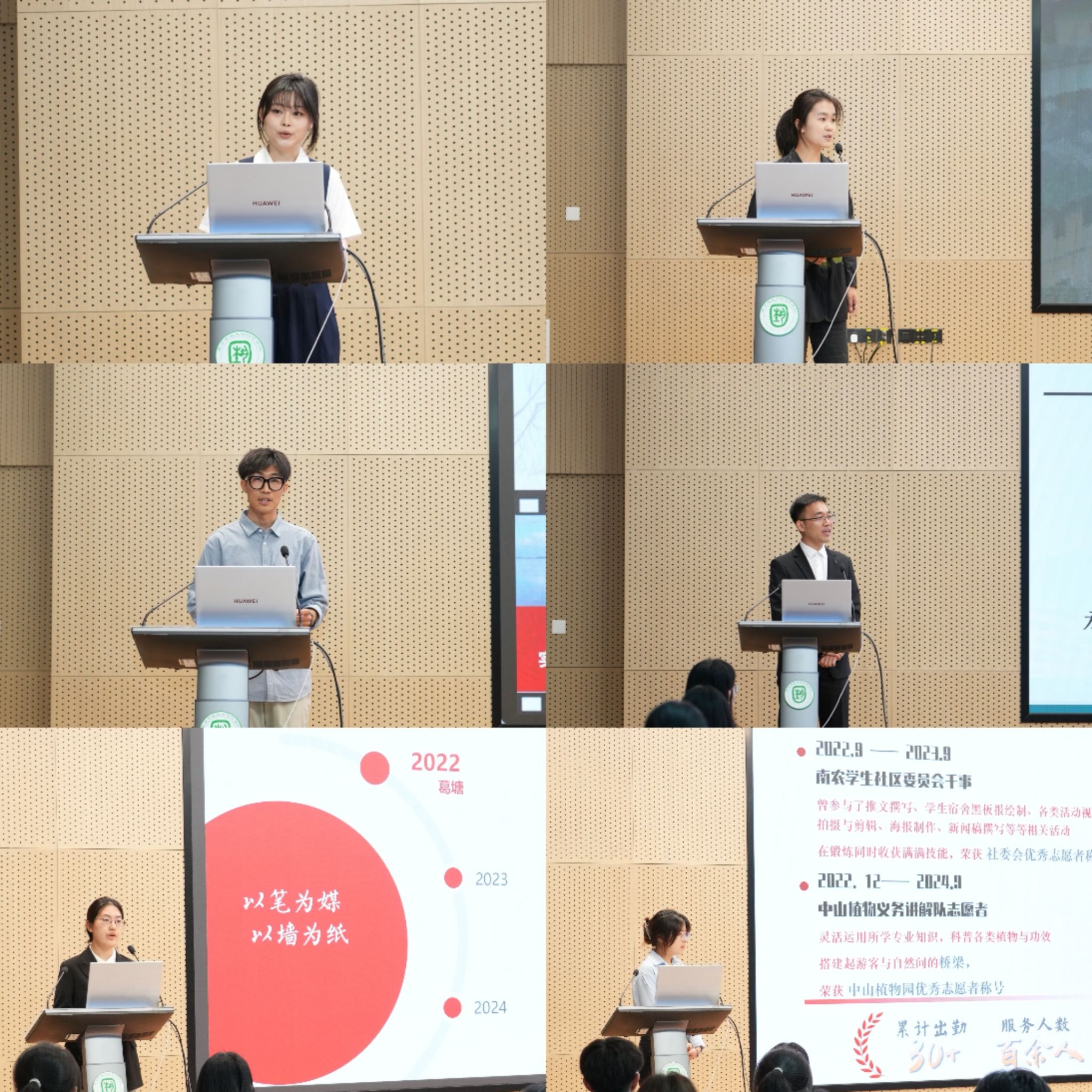 王冠华作为江苏省优秀班集体的代表,讲述了班级的“风景园林”的集体担当,诠释榜样集体对专业使命的躬身践行;赵嘉仪作为志愿服务类学生代表,通过志愿服务故事传递青年公益行动力与社会责任感,展现新时代大学生扎根社会的温度;匡嘉苗作为社会实践类学生代表,用墙绘展开了她与社会实践的故事,印证社会实践是青年洞察社会、服务社会的窗口;刘丁毅作为创新创业类学生代表,他所处的“贵梨不甜”项目一直走在促进梨产业发展的路上,凸显青年学子用创新驱动传统农业升级的担当;陈鹏作为学术科研类学生代表,分享了他的科研成果,体现了严谨求真的科研精神和“把论文写在大地上”的务实追求;秦个个通过“屋顶上有什么”的新颖视角,展现了从技术攻坚到人文关怀、从产业赋能到美学表达的园艺榜样形象。他们通过回顾成长历程,用自身的成长故事鼓励更多同学坚定理想信念,明确自身方向,书写青春华章,勇担时代使命。