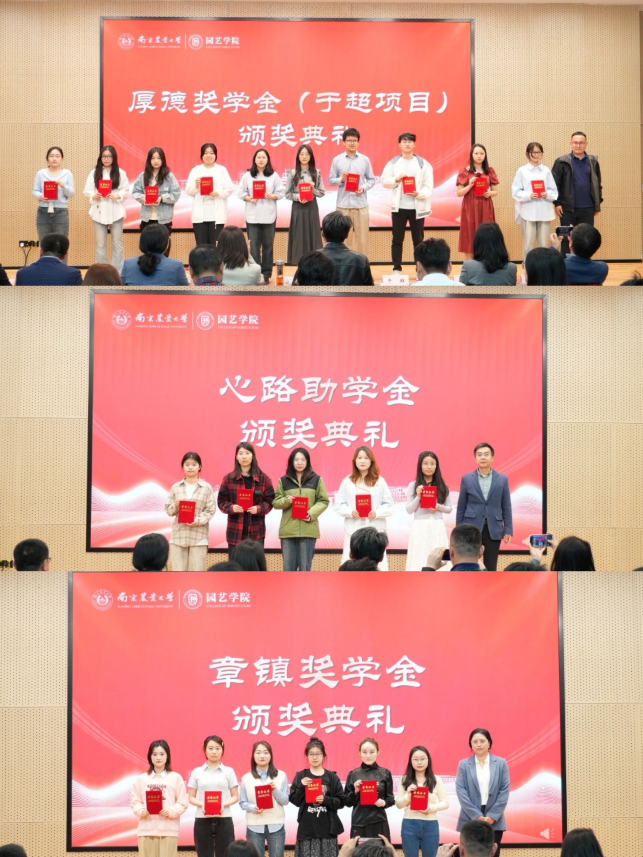 会议期间,大会为获百绿园林奖学金、坂田种苗企业奖学金、厚德奖学金(于超项目)、宏旭达园林奖学金、缤纷园艺助学金、章镇奖学金、心路助学金的70余名获奖同学颁发获奖证书,并为全国研究生乡村振兴案例大赛金奖团队、江苏大学生创新大赛等共计12项省级以上奖项获奖学生集体及个人颁发“园艺青年榜样集体”、“园艺青年榜样个人”证书。