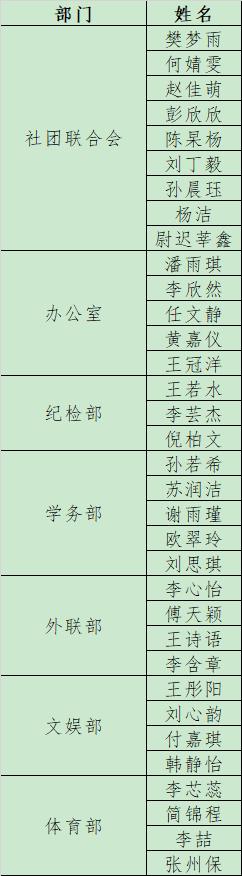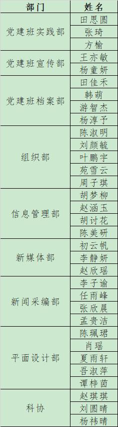 为进一步做好麻豆在线 学生工作,服务广大学生,经个人申请,麻豆在线 第二十一届学生组织各部门公开组织面试后,拟录取田思圆等人为各学生组织部门副部。具体名单公示如下(排名不分先后):