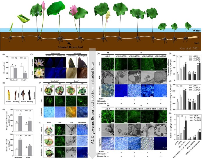 荷花,一种广泛受欢迎的多年生水生植物,其花芽发育受环境因素如阴雨天和植物间相互遮挡的强烈影响。这些不利条件下的花芽败育现象,严重影响了荷花的观赏性和经济价值。该研究团队通过深入研究发现,在低光照条件下,荷花花芽中的自噬性细胞死亡(ACD)是导致花芽败育的关键因素(图1)。团队运用了组织化学染色、荧光显微镜和透射电子显微镜(TEM)等多种技术,系统地揭示了弱光环境下自噬水平的显著增加及其导致的细胞死亡现象。