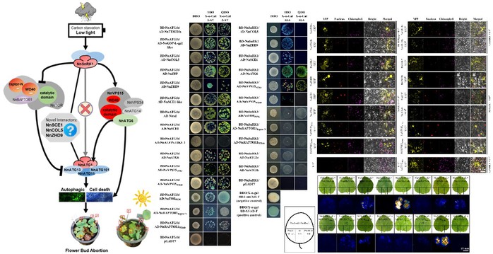 研究团队还发现了一条至关重要的信号调控途径,即NnSnRK1-NnATG1信号通路(图2),这一途径在荷花逆境下开花的调控中扮演着关键角色。通过对自噬相关基因(ATGs)的研究,团队发现NnSnRK1与NnATG1之间的相互作用,以及其他几种可能介导此信号调控网络的中间基因。研究发现通过阻断这条信号通路,即使在不利环境下,荷花也能更好地开花。这一发现不仅阐明了荷花应对不利生长环境的生物学机制,还展现了植物如何在能量节约和繁殖成功之间找到平衡。