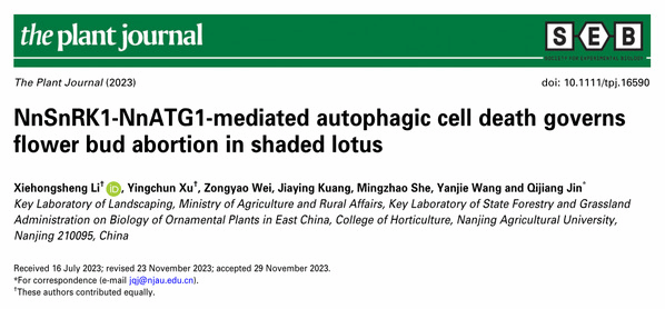 徐迎春教授团队在国际知名期刊《The Plant Journal》上发表了题为“NnSnRK1-NnATG1-mediated autophagic cell death governs flower bud abortion in shaded lotus”的论文。该研究揭示了自噬在植物繁殖过程中的重要调控作用,特别是在能量限制条件下,通过自噬调节开花过程,以提高植物的繁殖效率和能量利用效率,为理解植物如何在逆境下调整其生殖策略提供了新的视角。