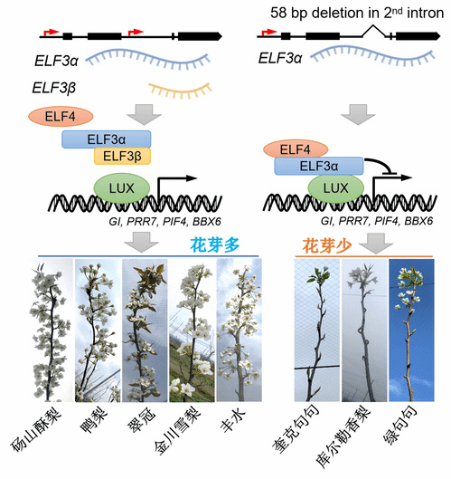 该研究发现,ELF3基因具有可变启动的特性,能够编码ELF3α和ELF3β两种转录本。ELF3β与ELF3α结合形成聚合体后,抑制ELF3α-LUX转录调控复合体的功能,进而促进花芽分化。同时,在苹果、大豆、番茄和拟南芥等物种中也鉴定到ELF3β转录本,表明ELF3基因的可变启动调控机制可能广泛存在于在植物界。研究结果进一步丰富了对梨花芽分化分子调控机制的认知,相关研究结果也授权了发明专利,为梨育种提供了可靠的分子标记。