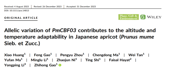 高志红团队在Plant, Cell & Environment在线发表了题为“Allelic variation of PmCBF03 contributes to the altitude and temperature adaptability in Japanese apricot (Prunus mume Sieb. et Zucc.)”的研究论文,揭示了PmCBF03等位基因的遗传变异调控不同海拔地区梅的低温适应性分子机制。